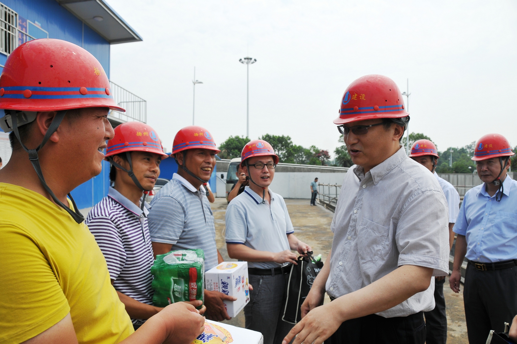 8月1日上午,揚州市副市長丁一在市安監(jiān)局局長熊佳芝、市交通運輸局黨委書記尹建平等陪同下,來到揚州西部交通客運樞紐建設工地,看望慰問高溫下堅持作業(yè)的建設者,并發(fā)放了毛巾、飲料、八寶粥等防暑降溫慰問品,感謝他們?yōu)槌鞘薪ㄔO作出的貢獻。