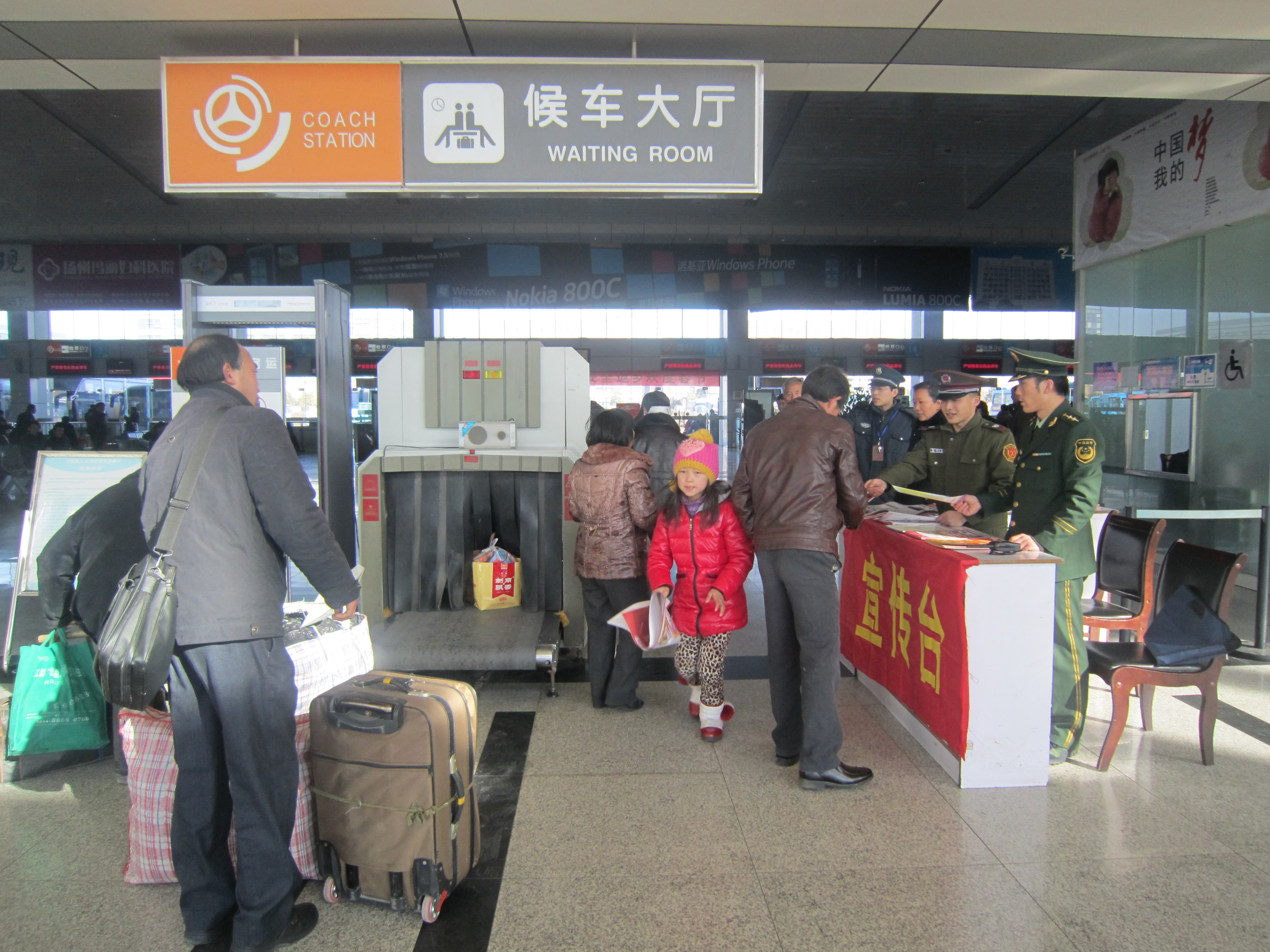 危險(xiǎn)品檢查儀旁,紅色的安全宣傳臺(tái)引人注目,武警揚(yáng)州消防支隊(duì)的幾名官兵和車站員工一起向接受危險(xiǎn)品檢查的旅客熱情發(fā)放宣傳畫,并提醒在返鄉(xiāng)旅程中應(yīng)該注意的安全事項(xiàng)。幾名女官兵還走進(jìn)候車廳發(fā)放,講解遇有緊急情況時(shí)的急救逃生知識(shí)。不少旅客在候車過程中,認(rèn)真看著宣傳畫,還不時(shí)交流,一旁的官兵不時(shí)接受旅客的咨詢,解答他們的問詢。