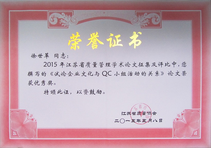 由江蘇省質(zhì)量協(xié)會(huì)舉辦的2014年江蘇質(zhì)量管理學(xué)術(shù)論文征集評(píng)選活動(dòng)落下帷幕,5月8日在南京華江賓館召開(kāi)了江蘇質(zhì)量管理學(xué)術(shù)論文表彰暨交流會(huì),江蘇省質(zhì)量技術(shù)監(jiān)督局副局長(zhǎng)張前、質(zhì)量處處長(zhǎng)兼省質(zhì)量協(xié)會(huì)副秘書(shū)長(zhǎng)祁寧清、省質(zhì)量協(xié)會(huì)會(huì)長(zhǎng)耿寧等及獲獎(jiǎng)作者參加了會(huì)議。集團(tuán)公司徐世革同志的《試論企業(yè)文化與QC小組活動(dòng)的關(guān)系》榮獲優(yōu)秀獎(jiǎng)。