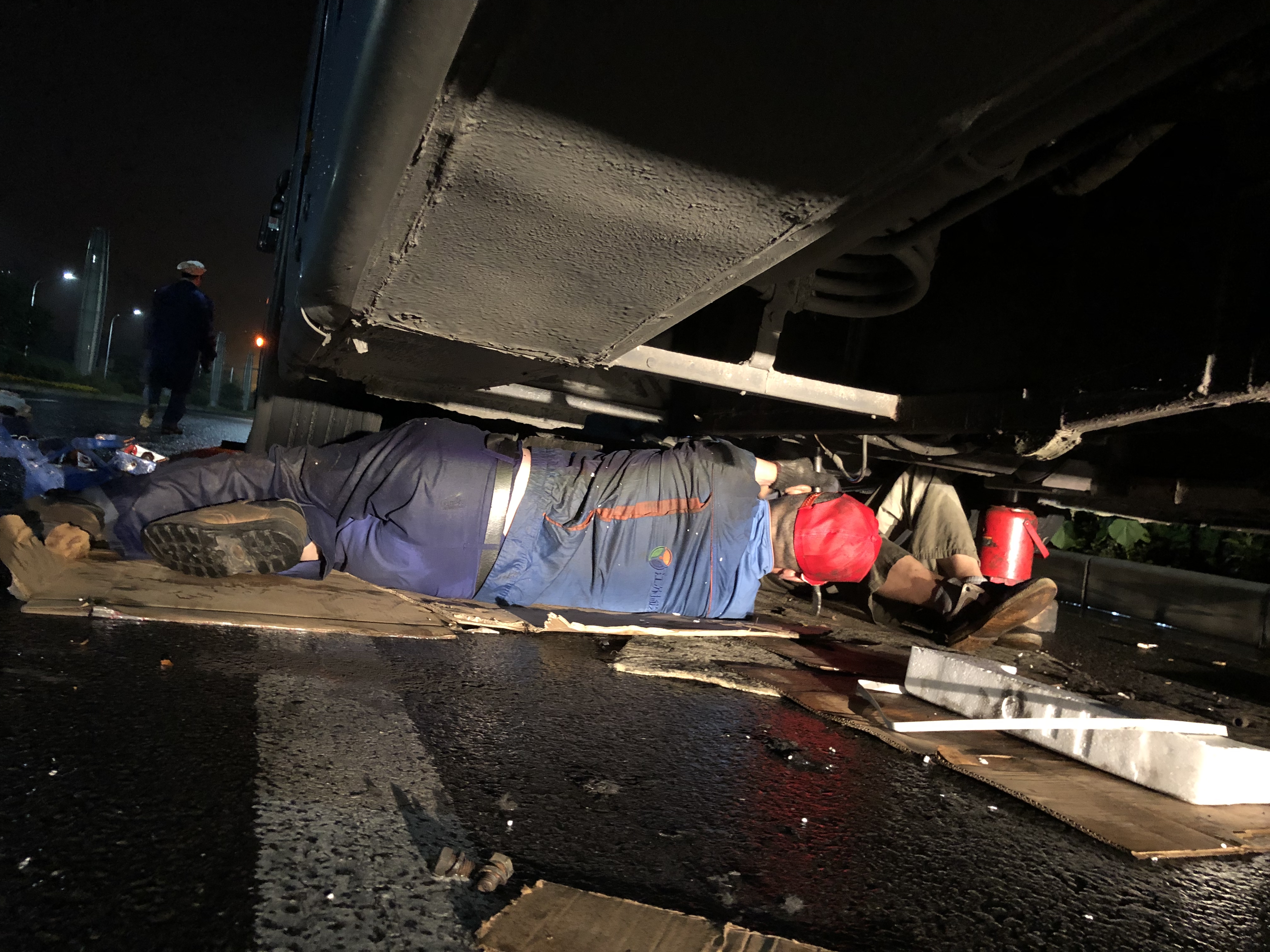 為了快速查出車輛故障,來(lái)到現(xiàn)場(chǎng)后師傅們也顧不得許多,只是簡(jiǎn)單地做了避雨防護(hù),就開始查找每一處可疑的故障,原來(lái)是離合器片磨損無(wú)法啟動(dòng),需要進(jìn)行更換。此時(shí)客服中心又聯(lián)系了在家休息的青工花兆貴,他冒雨回廠領(lǐng)取離合器三件套,再趕赴故障現(xiàn)場(chǎng)進(jìn)行安裝。由于是露天作業(yè),加之夜晚陰雨天氣,視線模糊,給維修工作帶來(lái)很大難度,但是維修師傅們團(tuán)結(jié)協(xié)作,經(jīng)過(guò)數(shù)小時(shí)的緊張搶修,故障解除,而此時(shí)搶修師傅們的衣服已經(jīng)完全濕透。