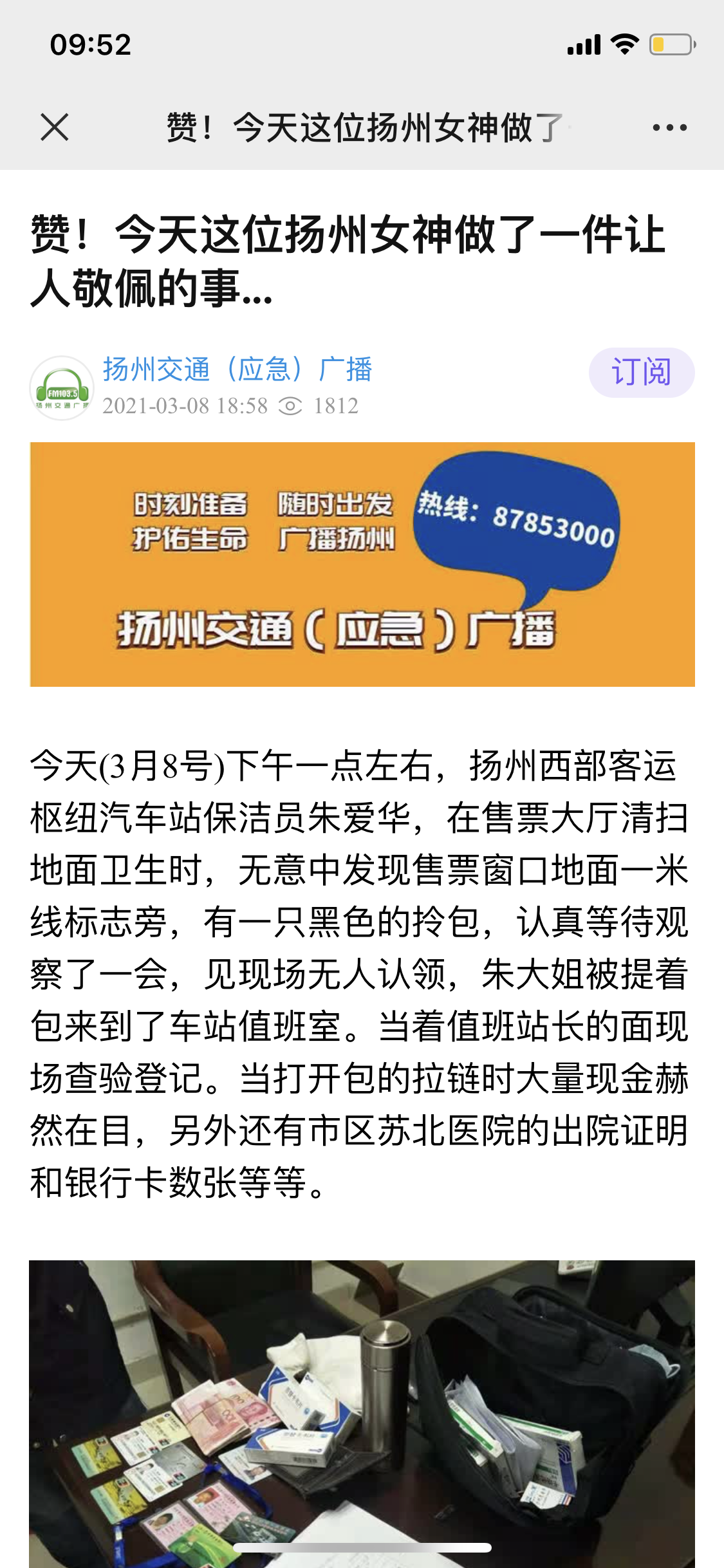 揚(yáng)州站保潔員工拾金不昧,平凡舉動(dòng)獲贊揚(yáng)