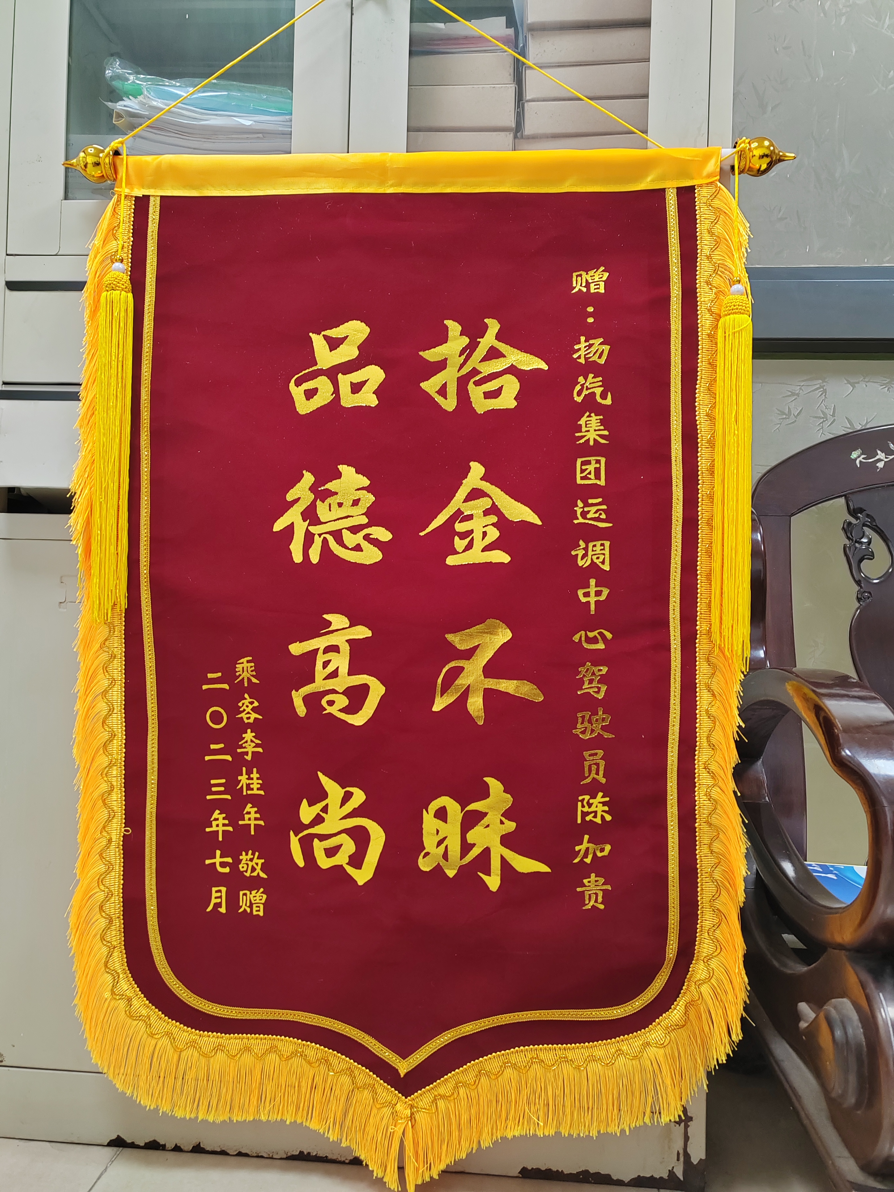 近日,江都汽車站收到了外地寄來的一面印有“拾金不昧 品德高尚”的錦旗交到了分公司相關(guān)負(fù)責(zé)人的手上,以此來表達(dá)對(duì)駕駛員陳加貴師傅拾金不昧行為的感謝。