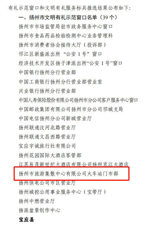 揚(yáng)州旅游集散中心火車站門市部榮獲市“2023年度文明有禮示范窗口”榮譽(yù)稱號(hào)
