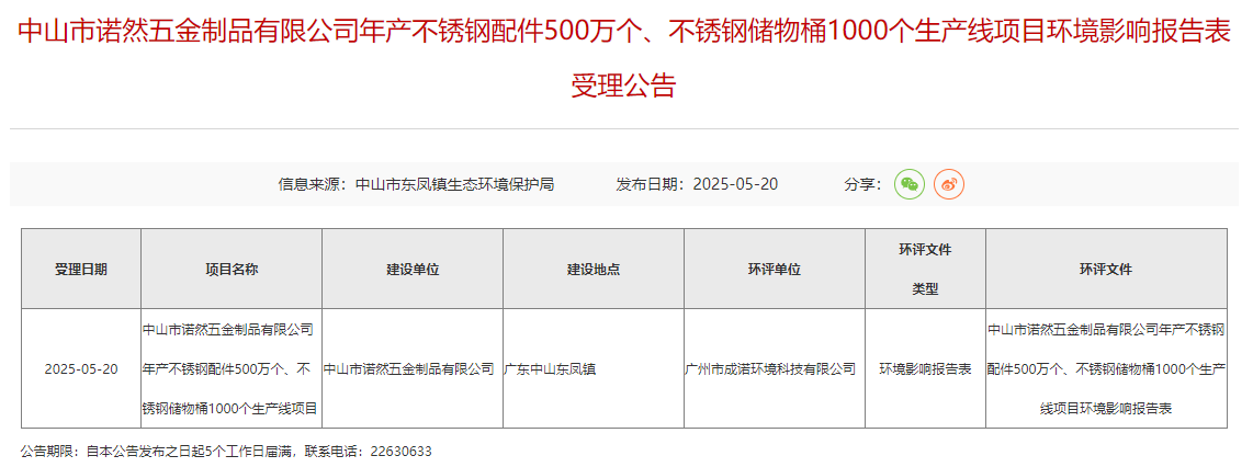 2025年5月20日,中山市東鳳鎮(zhèn)生態(tài)環(huán)境保護(hù)局受理中山市諾然五金制品有限公司年產(chǎn)不銹鋼配件500萬個(gè)、不銹鋼儲(chǔ)物桶1000個(gè)生產(chǎn)線項(xiàng)目環(huán)境影響報(bào)告表并對(duì)外進(jìn)行公告,公告期:5個(gè)工作日。