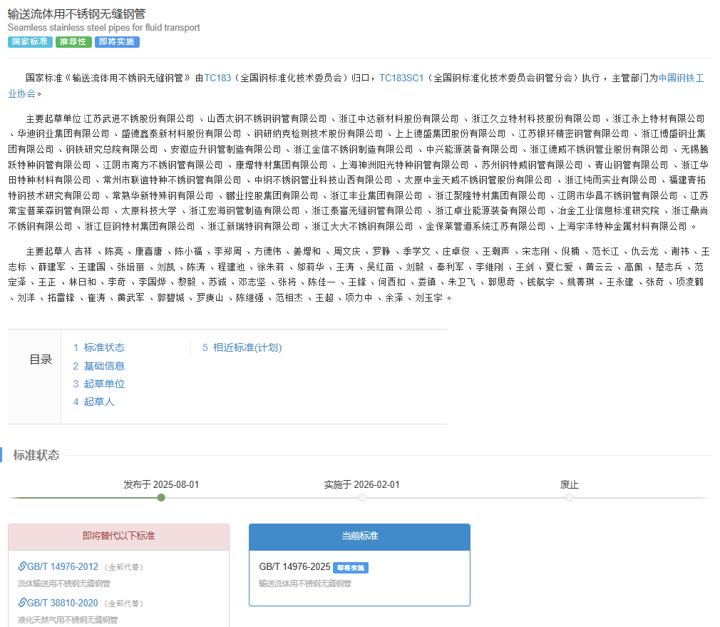 2025年8月1日,由江蘇武進(jìn)不銹股份有限公司 、山西太鋼不銹鋼鋼管有限公司 、浙江中達(dá)新材料股份有限公司 、浙江久立特材科技股份有限公司等主要單位起草的國家標(biāo)準(zhǔn)《輸送流體用不銹鋼無縫鋼管》發(fā)布,將于2026年2月1日實(shí)施。