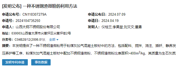 2024年7月9日,山西太鋼不銹鋼股份有限公司成功申請一項名為“一種不銹鋼渣微粉的利用方法”專利,申請公布號為CN118307279A,申請日期為2024年4月19日。